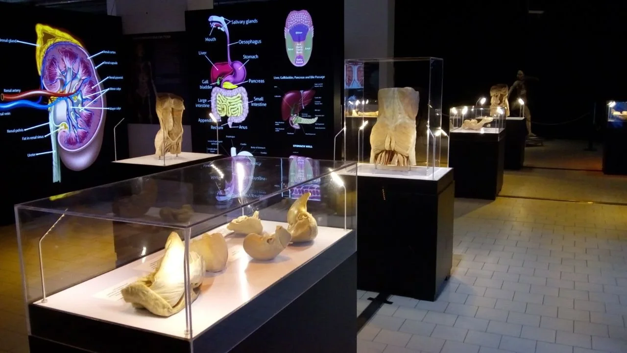 La muestra incluye 8 cuerpos reales y más de 100 órganos, preservados mediante plastinación, un proceso científico que permite conservar con todo detalle cada pieza.