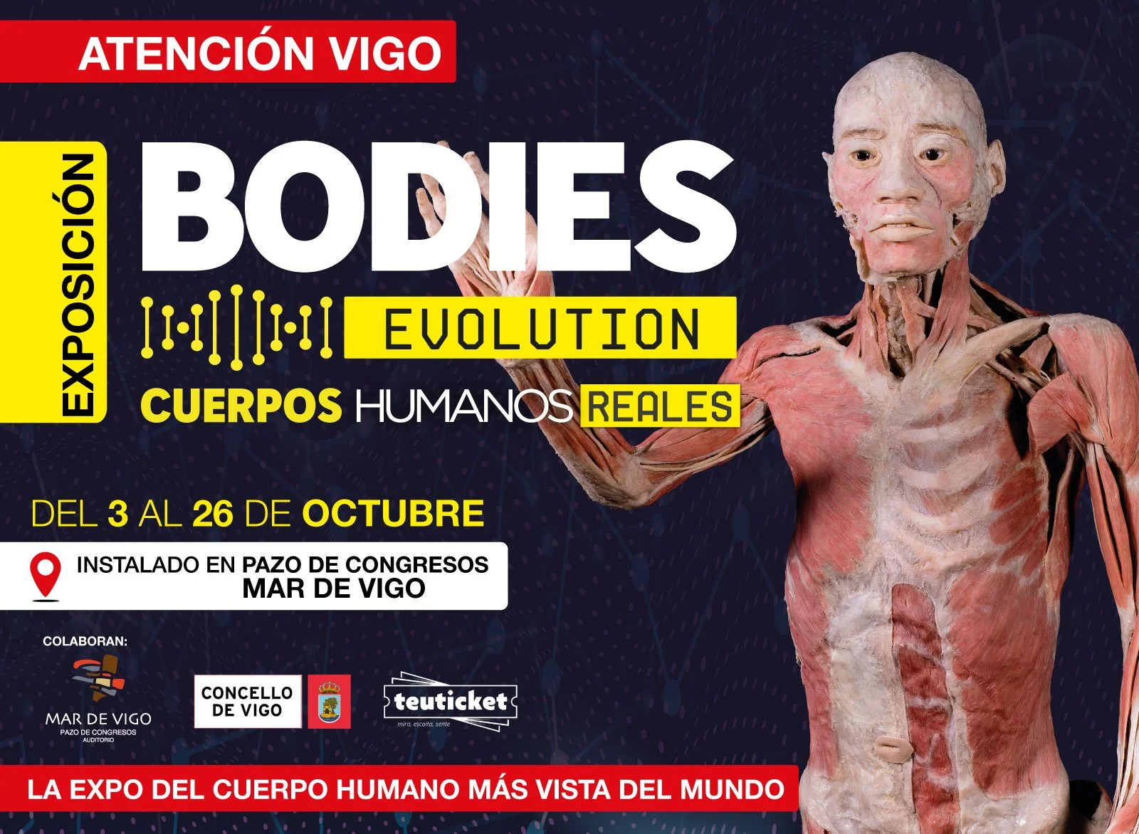 Llega a Vigo Bodies Evolution, la exposición número 1 del mundo sobre el cuerpo humano, en el Palacio de Congresos Mar de Vigo del 03 al 26 de octubre de 2025, en los que incluye 8 cuerpos reales y más de 100 organos.